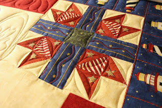 I'm almost done with the first row of blocks on the Biblical Blocks quilt. There's one more thread color change, and I would need to roll the quilt forward a bit to finish the blocks; but right around midnight, I ran out of steam. The names of the blocks are beneath each one.